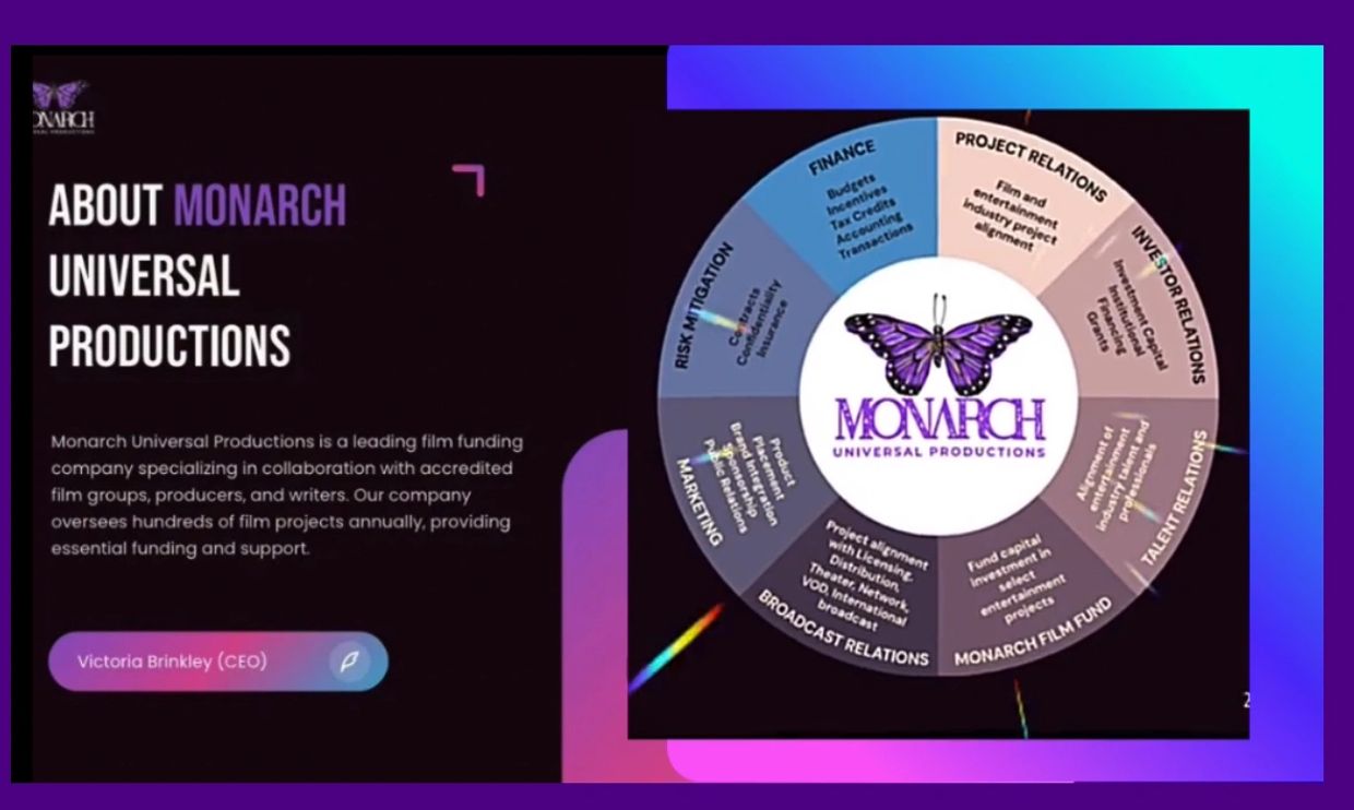 Monarch Universal Productions offers a broad spectrum of opportunities across film, television, live concerts, and cultural events. Our team not only develops and packages feature films but also produces music tours, special events, and legacy-driven projects that connect directly with audiences worldwide. This multi-platform approach creates avenues for investors, brands, and creative partners to engage in diverse ways, from film financing and co-production to sponsorships, event partnerships, and global distribution. By uniting entertainment with cultural impact, Monarch provides opportunities that extend far beyond the screen.